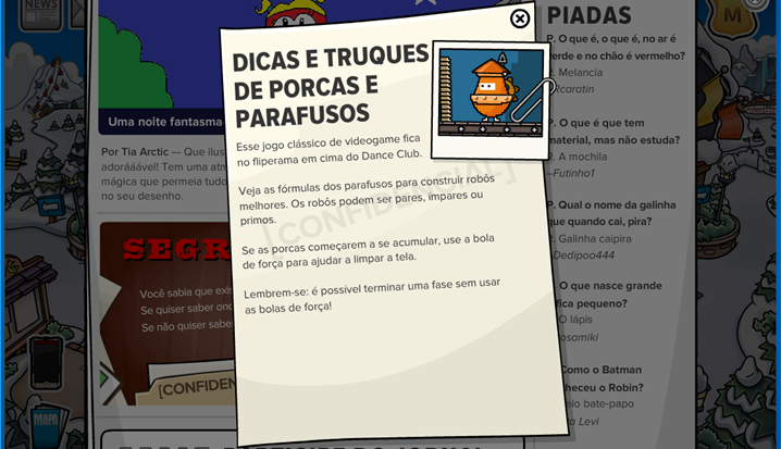 E por fim, o Confidencial desta semana traz algumas dicas para jogar o clássico Porcas e Parafusos, mini-jogo que se localiza na Área Vip.