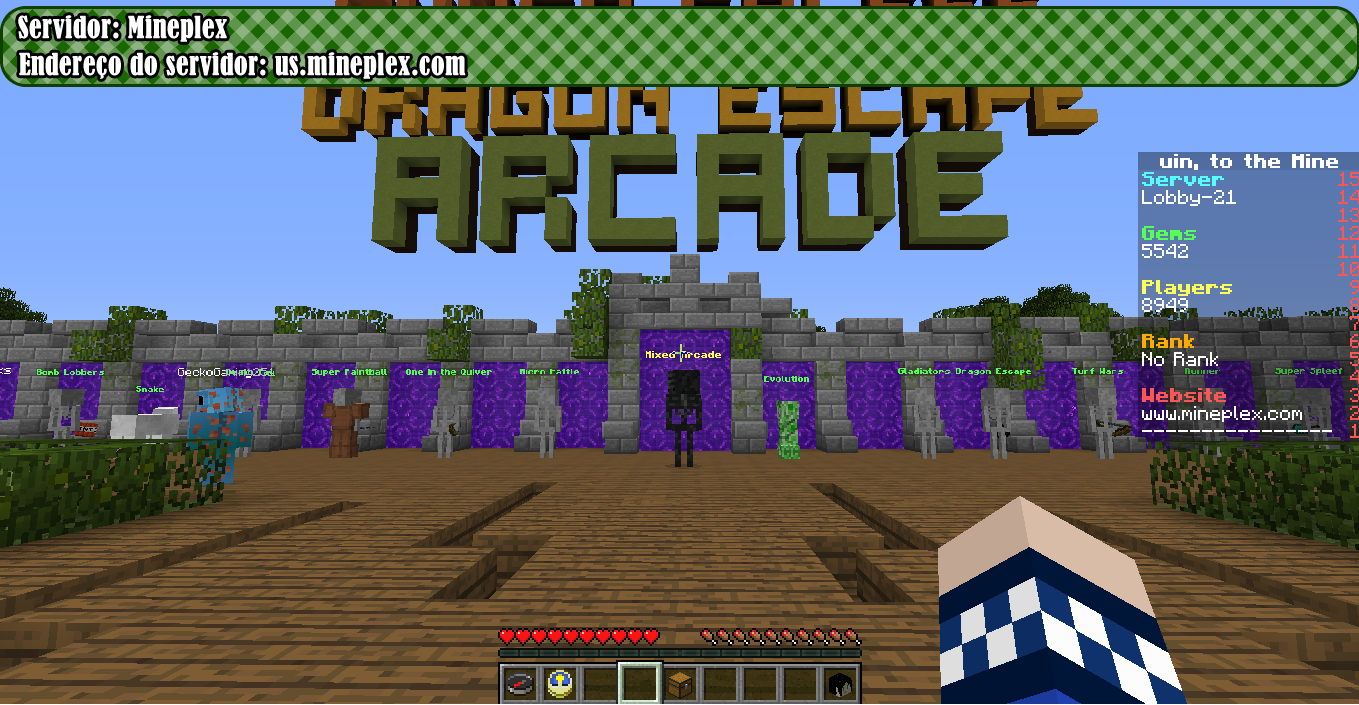 Mineplex é um servidor que possui basicamente o mesmo conceito do Hypixel, porém este possui alguns minijogos adicionais. Minijogo recomendado: Mixed Arcade